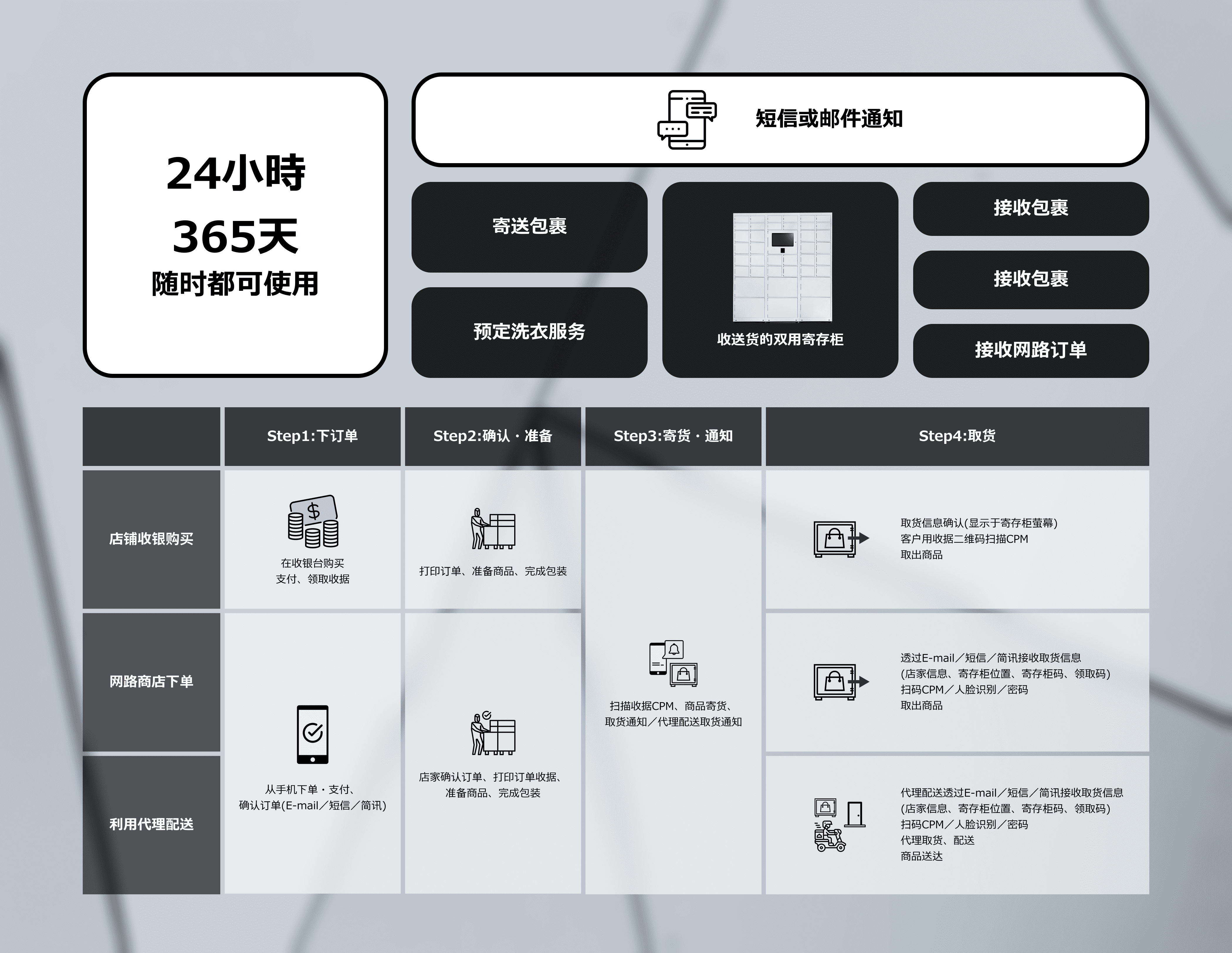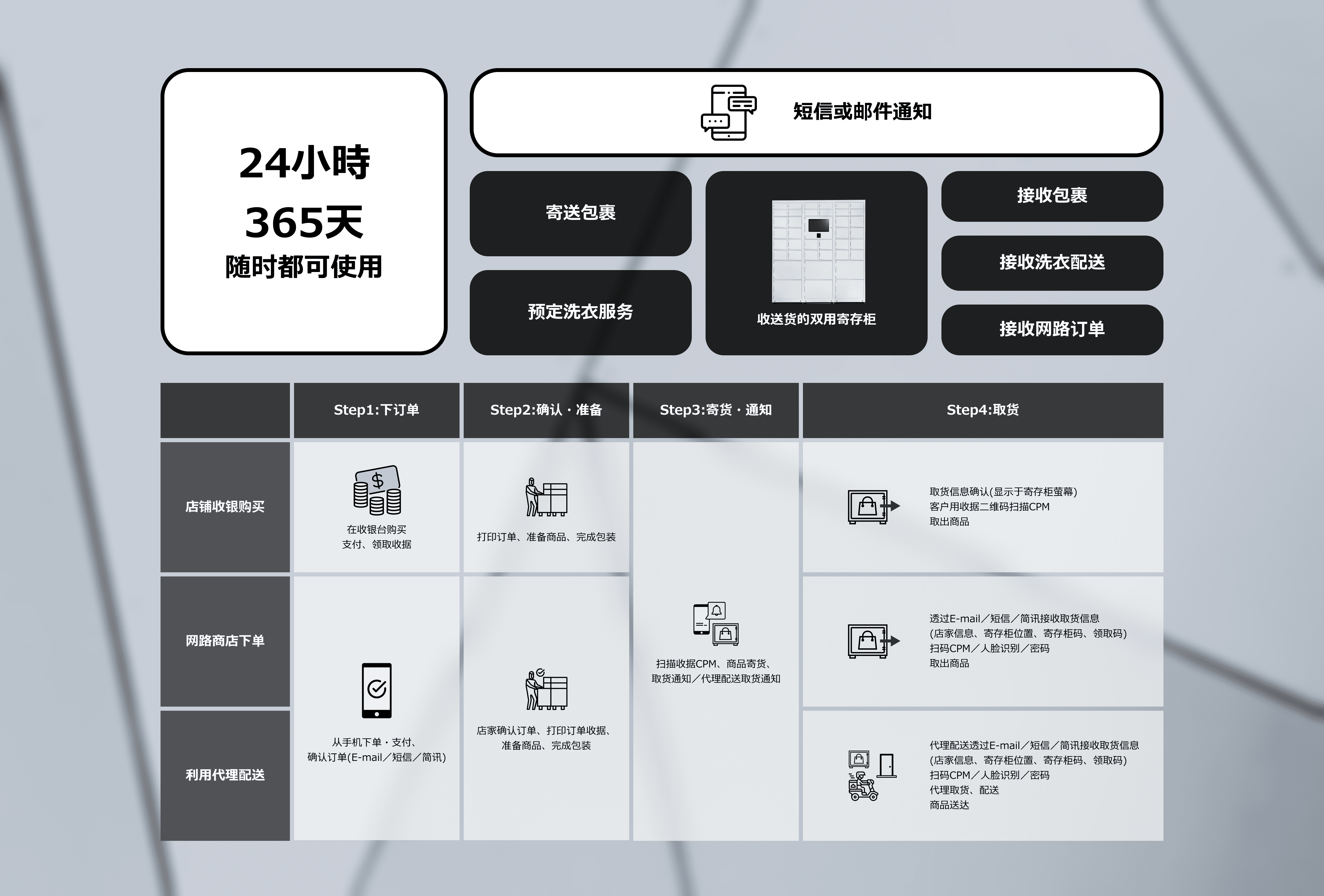 可通过寄存柜与各式应用程式的组合来达成客製化的服务,适用于办公室、物流业、零售业及餐饮业等各种用途。